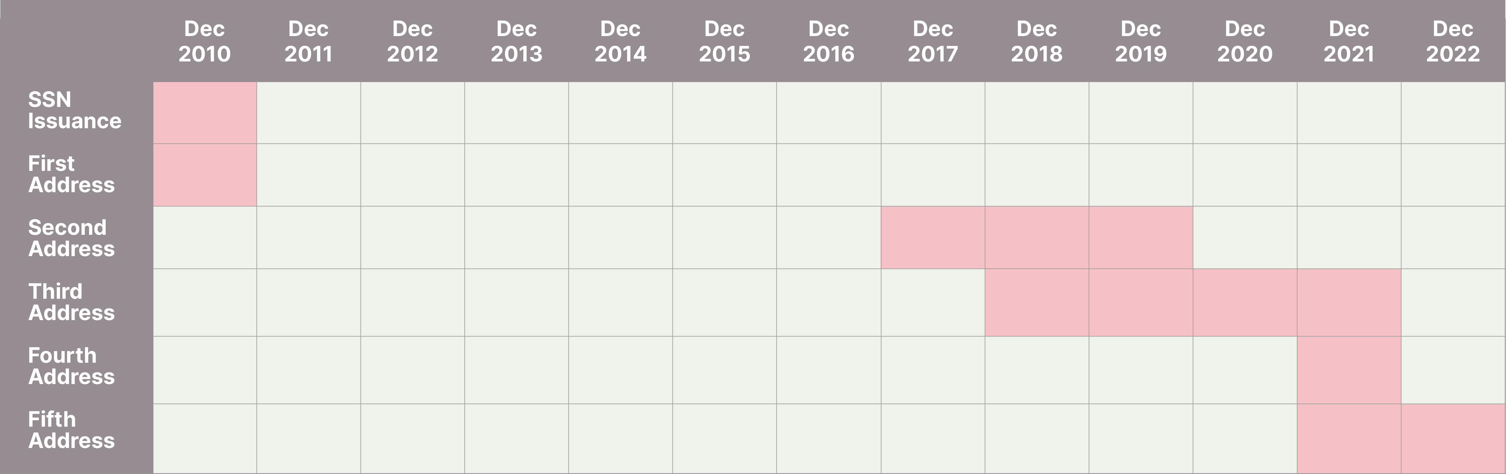 In one instance, we saw a consumer with a short address history in Alaska in 2010. The next instance this consumer appeared in the financial services ecosystem was in 2017 in California – the 7 year gap in the consumer history is a clue pointing to this being an instance of assumed identity fraud. - Ties to bad addresses: Many of the same addresses appear on the credit reports of the assumed identities. This is likely because those addresses actually belong to one of the individuals involved in perpetrating the fraud, allowing them to comfortably access credit cards and other financial documents sent by mail intended for the victim.